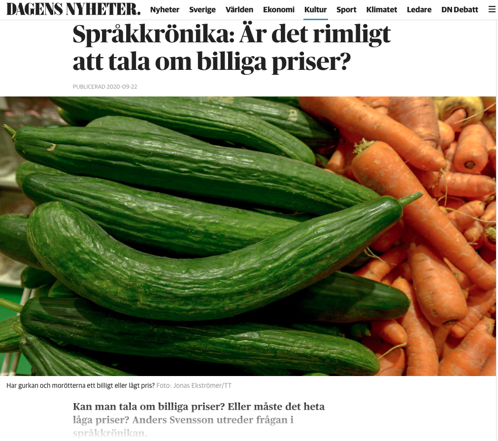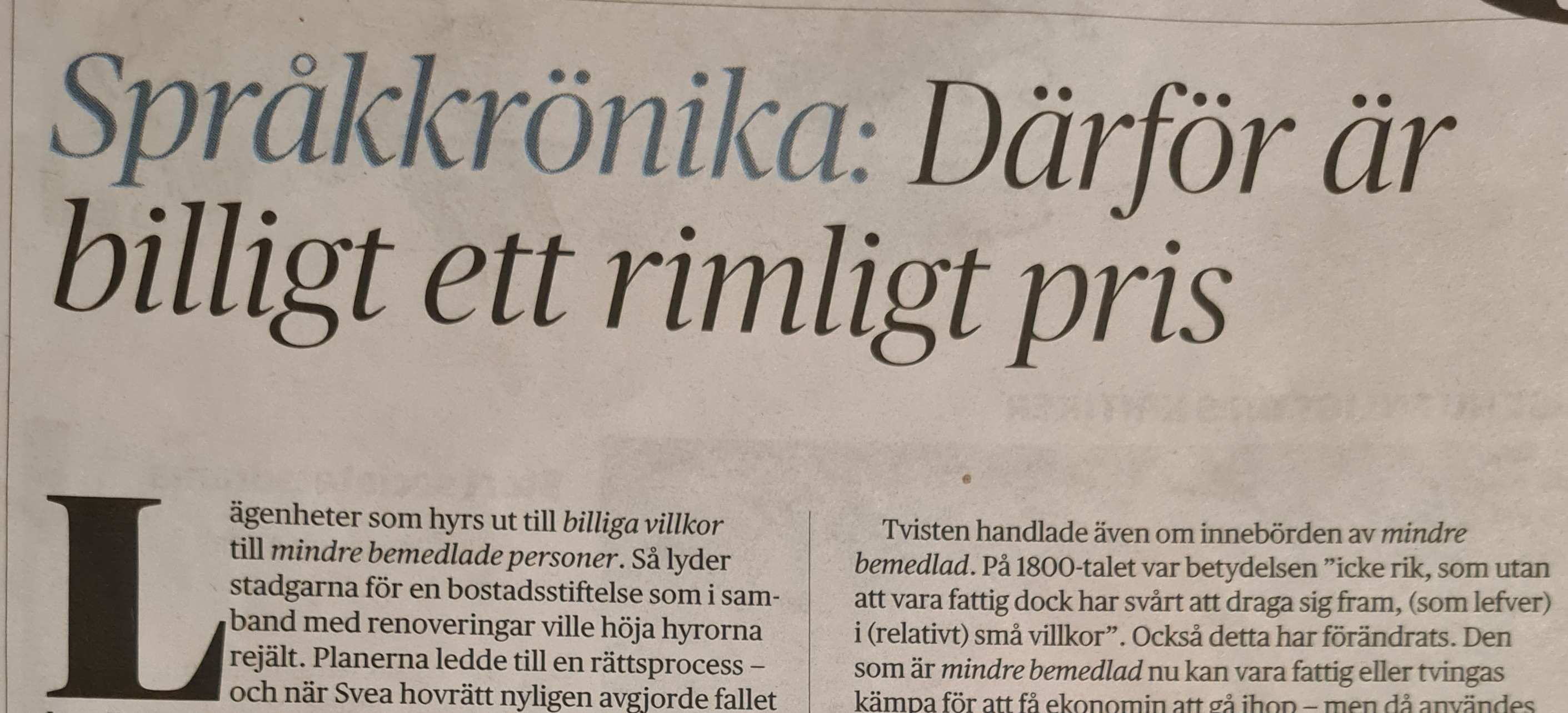 DNs Språkkrönika har flera gånger tagit upp ordet billig och hur dess betydelse förändrats över tid. Artiklarna har skrivits av Anders Svensson, chefredaktör för Språktidningen.